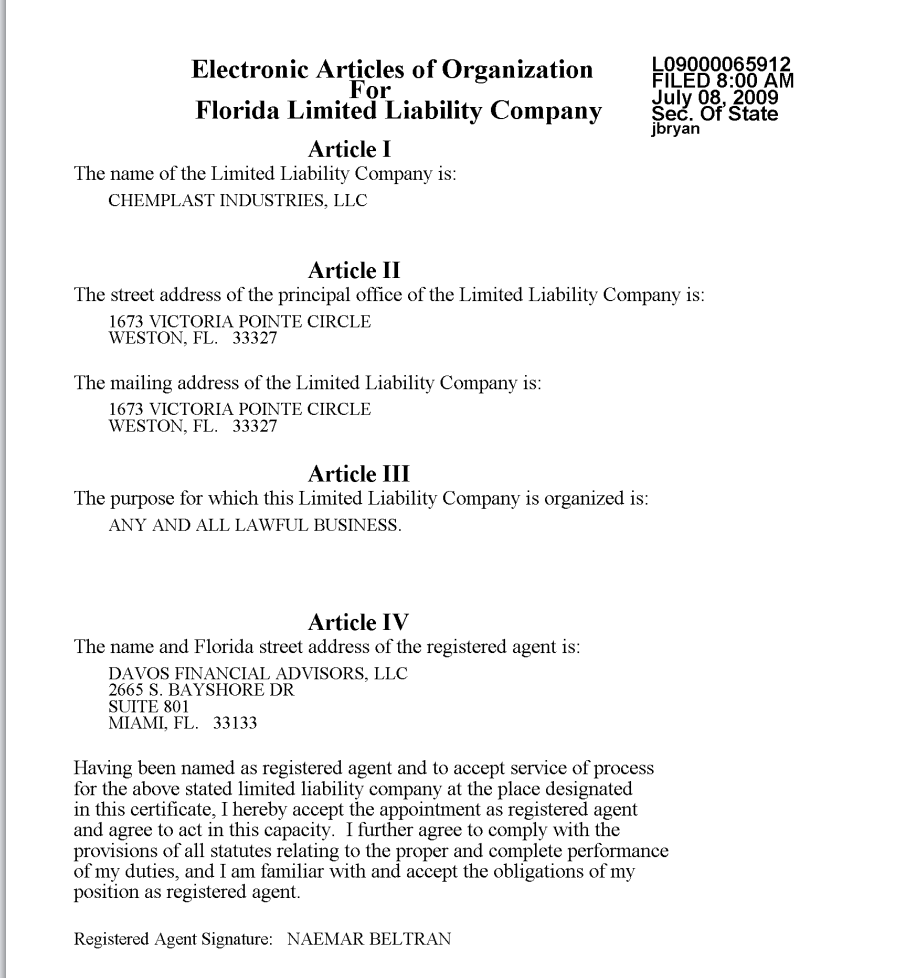 Chemplas Steel Industries Ltd. es una empresa inicialmente fue constituida en la Florida con el nombre de Chemplas Industries LLC el 8 de julio de 2009, donde aparecen los nombres de Pedro A. Pages y Lermit Pages. El agente registrador fue Davos Financial Advisor LLC (empresa de Andrés Coles, Naemar Beltrán, Adam Stramwasser, David J. Osío, Andrés Sotillo, Alexander Rosania y Richard Shaker.