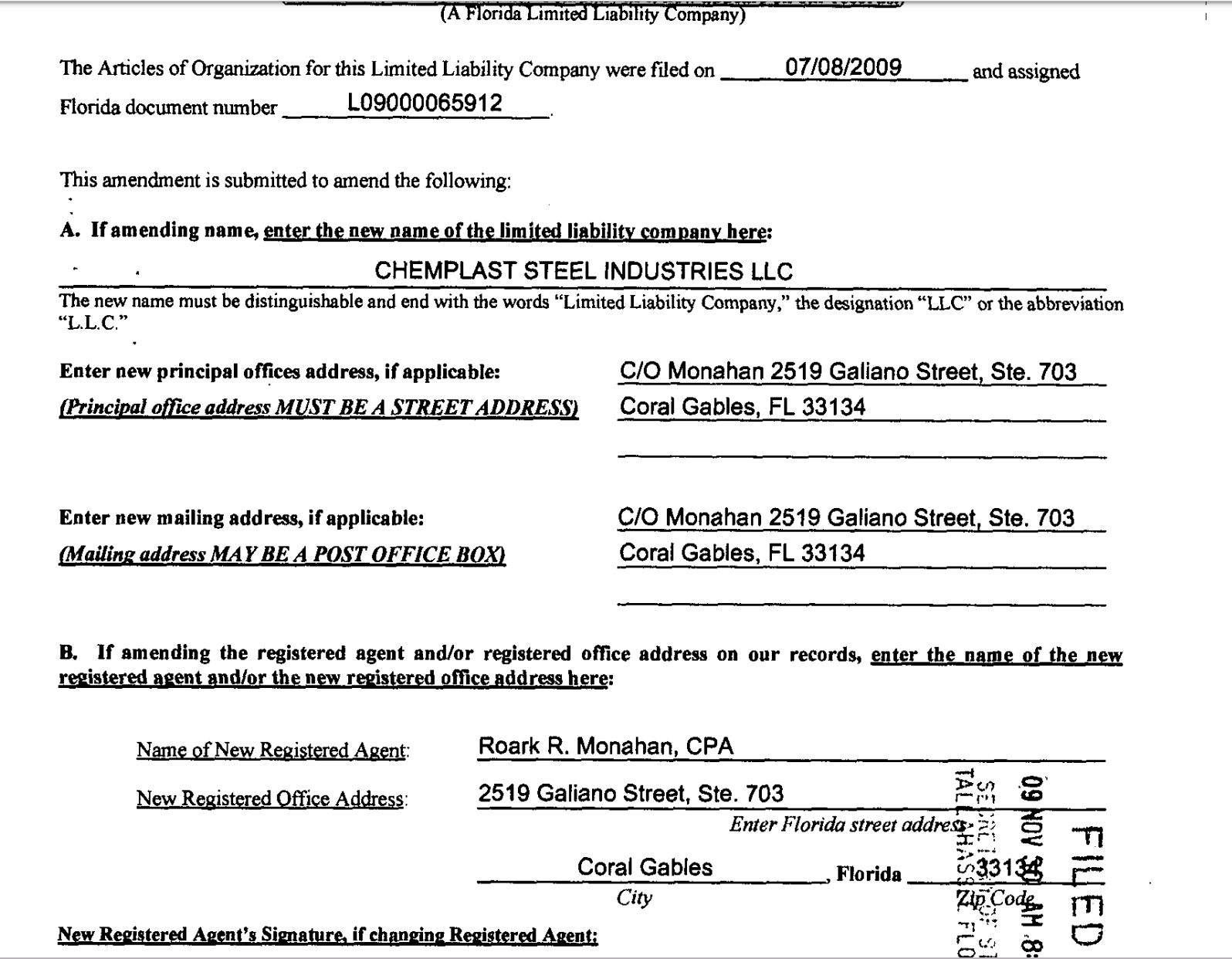 Luego se cambió el nombre a Chemplas Steel Industries LLC. y el agente registrador pasó a ser Roark R. Monahan CPA.