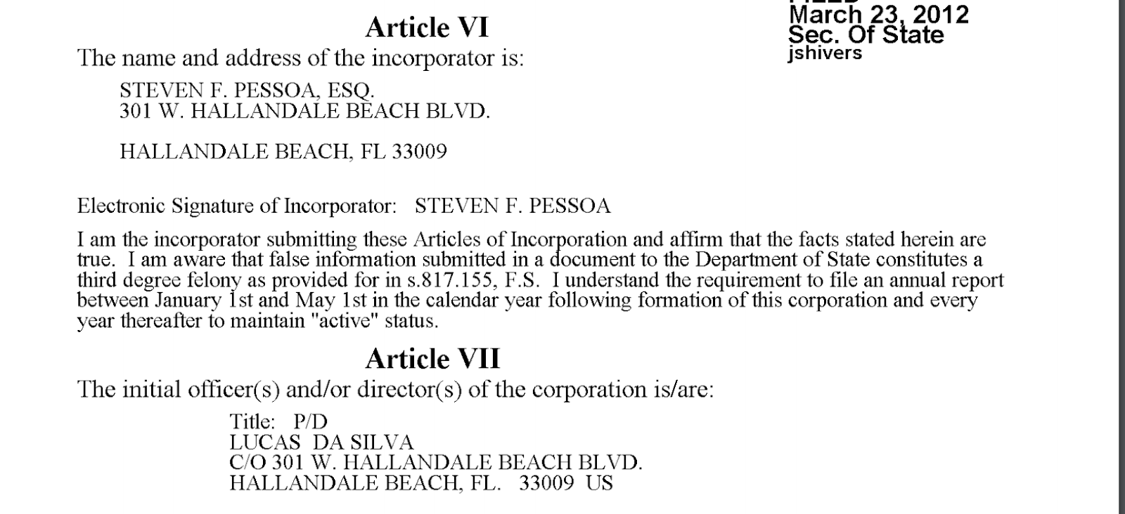 ZHINENG JIAOYI LIMITED INC. aparece en estos momentos con estatus inactivo en el sistema de registro de empresas del estado de la Florida. La firma referenciada en la la corte, fue creada el 23 de marzo de 2012, bajo el número P12000028791y con el FEI/EIN Number 45-4986623. Los documentos legales muestran que la empresa tenía varias direcciones: 6855 SW 81st Street Suite 400, Miami, FL 33143 y 5805 Blue Lagoon Dr. Ste 200, Miami, FL 33126