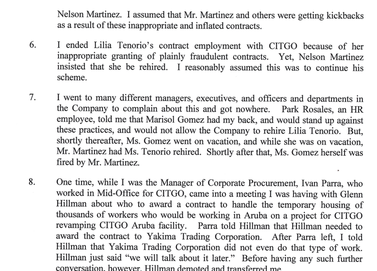 Aseguró que, durante el 2016, supo que varios empleados contratados de CITGO, incluyendo a Lilia Tenorio, Laymar Peña, Juan Pacheco y Marco Bermúdez —todos cercanos a Nelson Martínez— estaban otorgando contratos de parte de CITGO, sin seguir el protocolo de la compañía en materia de materia de procedimientos, para empresas que no tenían las calificaciones y que presentaban servicios y productos con elevados sobreprecios.