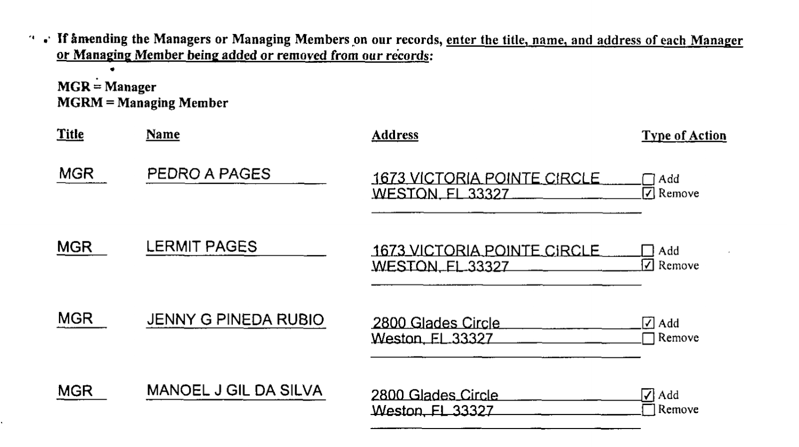 A través de un acto de disolución la empresa concluyó su actividad el 26 de septiembre de 2014. El agente registrador for el escritorio jurídico ROZENCWAIG & NADEL, LLP 301 W. Hallandale Beach Blvd. Hallandale Beach, FL 33009.