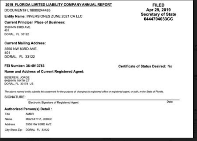 Inversiones Zune 2021 CA LLC es, de acuerdo a Sunbiz, una empresa registrada el 17 de octubre de 2018 en el estado de la Florida bajo el número L18000244485, FEI/EIN 36-4913783. Esta firma cuyo estatus actual es activo, tiene como agente registrador a Jorge Besereni, quien suministró como dirección el 6469 NW 104TH CT, Doral, FL 33178.