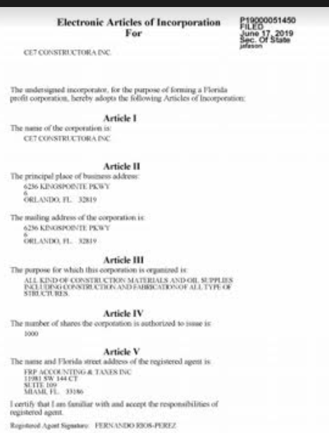 Asimismo, el departamento de estado de la Florida informa mediante su portal Sunbiz, que Transporte y Construcciones RV Corp. es una empresa registrada en esa entidad el 11 de octubre de 2019, bajo el número P19000080046, número FEI/EIN 84-3502853.