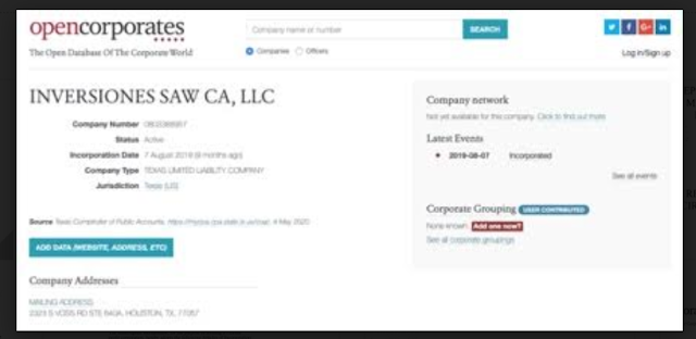 Inversiones Saw CA. LLC es una compañía activa, según el portal Open Corporates, registrada en Houston, Texas, el 7 de agosto de 2019, bajo el número 0803388957[23].
