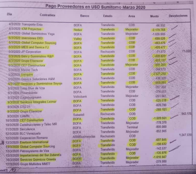 * El 5 de marzo de 2020 se llevaron acabo 7 operaciones, una de ellas a Inversiones D-03 LLC, vía Valley, le fueron transferidos USD 699.526; otra a Global Computer Sourcing de Venezuela C.A., vía BOFA, por USD 463.476; Mes and Service F.J. LLC recibió vía BOFA, USD 409.477; Servicios y Suministros Petroleros R&P Inc., vía BOFA, 428.829; el Grupo Ebenezer C.A. recibió por BOFA, la cantidad de USD 459.197; por BOFA, CE7 Constructora Inc. recibió USD 691.200; también por BOFA, Servicios y Suministros Soyoje LLC fue beneficiada con una transferencia por USD 959.061.