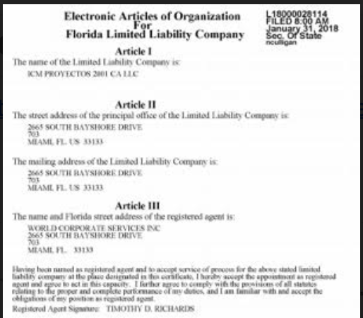 [2] Sunbiz. Division of Corporations. ICM Proyectos 2001 CA LLC. http://search.sunbiz.org/Inquiry/CorporationSearch/SearchResultDetail?inquirytype=EntityName&directionType=Initial&searchNameOrder=ICMPROYECTOS2001CA%20L180000281140&aggregateId=flal-l18000028114-360a79a4-a894-4594-bb6e-ba3d51b8daa1&searchTerm=ICM%20Proyectos&listNameOrder=ICMPROYECTOS2001CA%20L180000281140