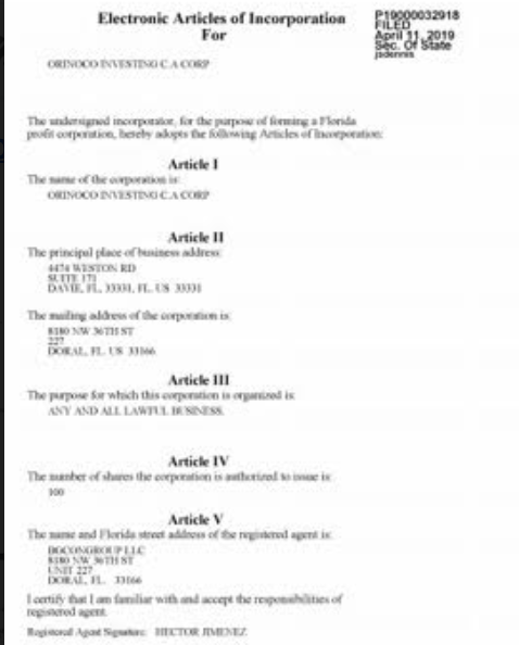 En el estado de la Florida también fue registrada Orinoco Investing Corp., el 11 de abril de 2019, bajo el número P19000032918.