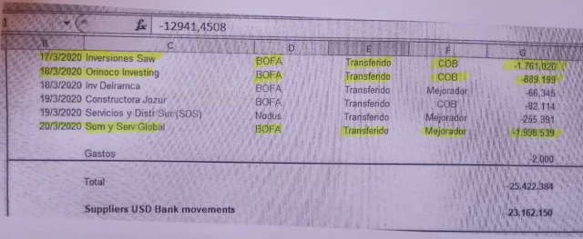 El 7 de febrero de 2020, CE7 Constructora Inc., vía BOFA, recibió USD 367.537; Servicios Integrales Leimar C.A. LLC, por BOFA, USD 775.827.