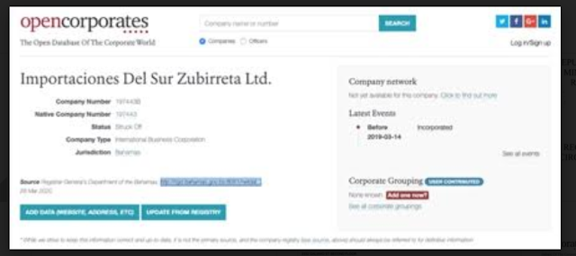 Entretanto, el portal Open Corporates informa que Importaciones del Sur Zubirreta Ltd., También es una empresa registrada en Las Bahamas el 14 de marzo de 2019, bajo el número 197443B[14].