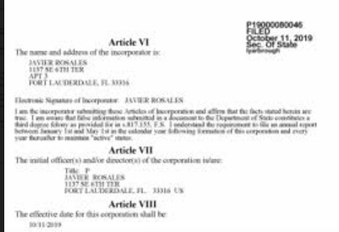 Entrtetanto, el portal Sunbiz informa que Suministros y Servicios Global CA LLC tambien es una empresa activa que fue registrada en el estadoi de la Florida el 19 de noviembre de 2019, bajo el número L19000287700, número FEI/EIN 84-3901672. El agente registrador es José F. Neptune.