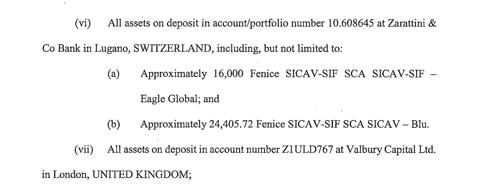Asimismo se congelaron todos los fondos depositados en la cuenta 1466054 Del City National Bank y los de la cuenta -portafolio 1303311-00 Deltec Bank & Trust Limited en Nassau, Las Bahamas; USD 5.000 Global Securities Trade Clase D-Serie D-1-15813-315 LU098615466 Fenice SICAV SIF Eagle Global.