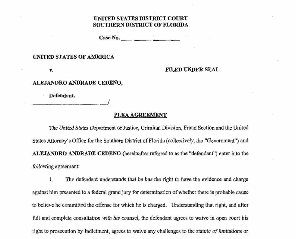 En un documento, dado a conocer por las autoridades norteamericanas, Andrade asume la responsabilidad de los delitos imputados y acuerda cooperar con el gobierno de los Estados Unidos, suministrando toda la información requerida para evidenciar las acusaciones contra varios funcionarios y miembros de la llamada boliburguesía venezolana.