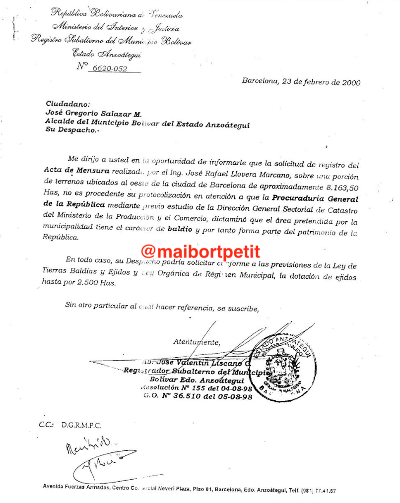 El 23 de febrero de 2000, el registrador subalterno del Municipio Bolívar del estado Anzoátegui, José Valentín Liscano C., envió el oficio signado con el número 6620-052 al alcalde del municipio Bolívar del estado Anzoátegui, José Gregorio Salazar M., en el que le comunicaba la improcedencia de su solicitud de registro del Acta de Mensura realizado, por el ingeniero José Rafael Llovera Marcano, sobre una porción de terrenos ubicados al oeste de Barcelona de aproximadamente 8.163,50 hectáreas.