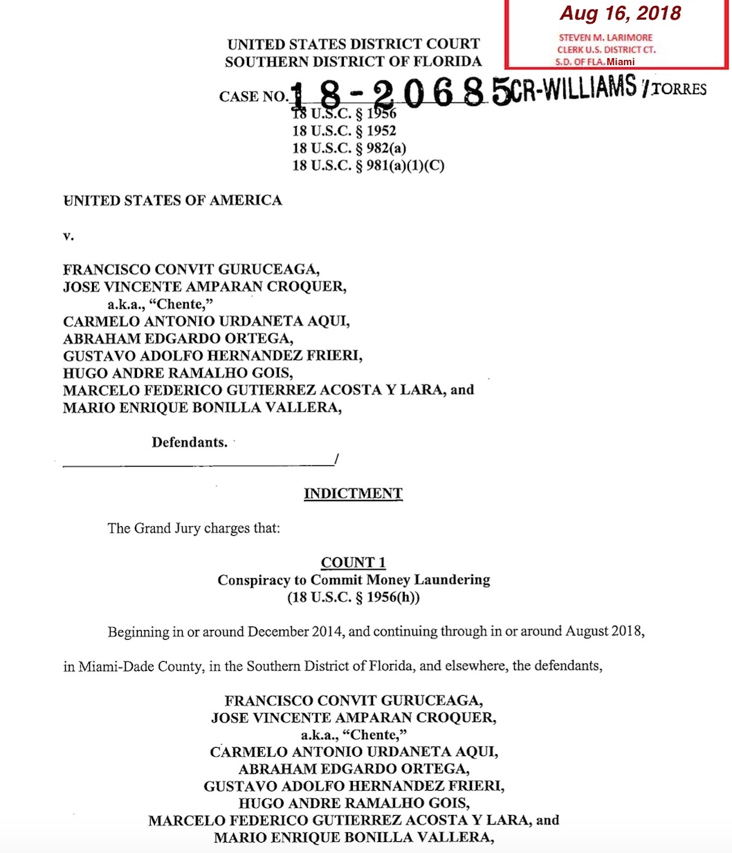 La acusación de la fiscalía señala que desde diciembre de 2014 hasta julio de 2018, Matthias Krull, junto con Francisco Convit Guruceaga, José Vicente Amparan Croquer alias «Chente», Carmelo Antonio Urdaneta Aqui, Abraham Edgardo Ortega, Gustavo Adolfo Hernández Frieri, Marcelo Federico Gutiérrez Acosta y Lara, Mario Enrique Bonilla Valiera y otros, conspiraron para participar en transacciones monetarias, ocultar, disfrazar y lavar de otra manera cientos de millones de dólares en fondos que eran producto de actividades criminales —sobornos pagados a extranjeros y violaciones de la Ley de Prácticas Corruptas en el Extranjero (FCPA)—, incluidas las transacciones con «US Financial Institution 1».