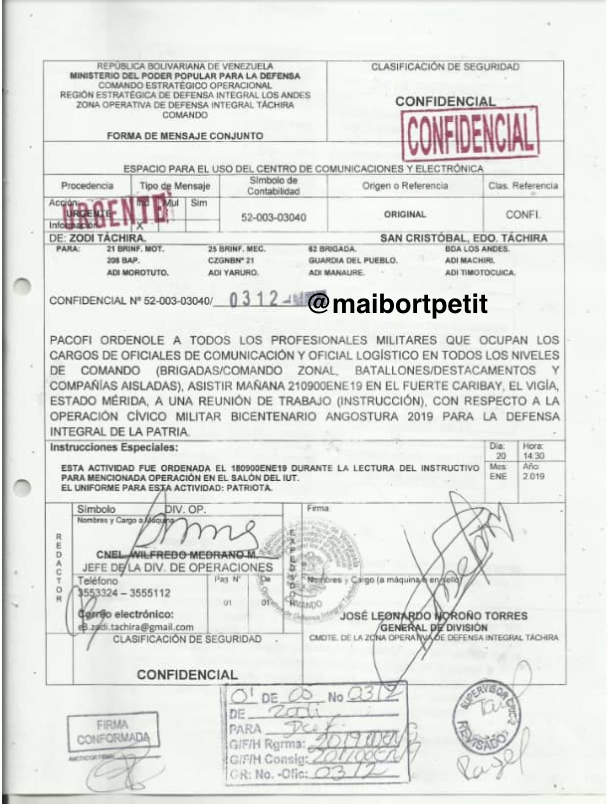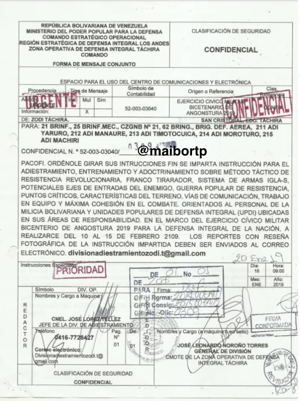 En la última comunicación filtrada se ordena cumplir estrictamente con las instrucciones dada en las ordenes preparatorias N-1 y 2 de echa 15 y 17 de enero de 2019, avi como también lesiones de Comando efectuadas en la sede del Comando ZODI del Táchira y en. la Sede de IUT, donde deberán abocarse a entrenar a la milicia bolivariana en MTRR, Francotiradores y en los sistema de defensa aérea IGLAS, así como deberán pasar revista a las UPDI de su área de responsabilidad, según guía de verificación.