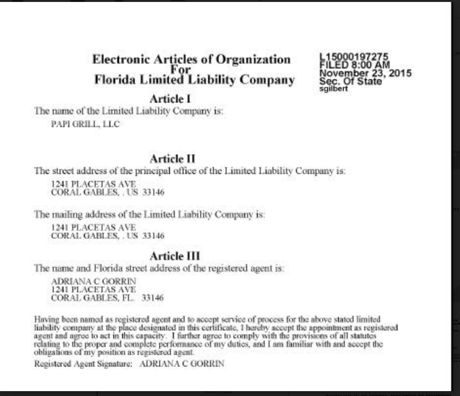 [10] Sunbiz. Electronic Articles of Organization for Florida Limited Liability Company. Papi Grill LLC. http://search.sunbiz.org/Inquiry/CorporationSearch/ConvertTiffToPDF?storagePath=COR%5C2015%5C1130%5C90367169.tif&documentNumber=L15000197275