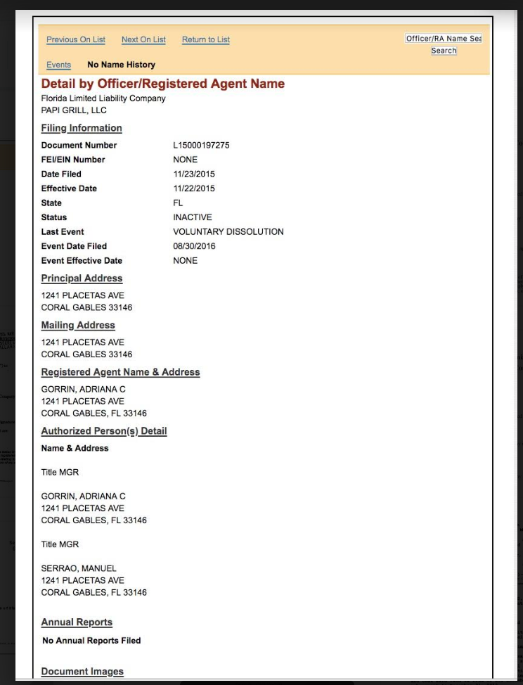El inmueble había sido domicilio de otra compañía, a saber, Papi Grill LLC[8], la cual según el portal Sunbiz, es una empresa registrada en el estado de la Florida el 23 de noviembre de 2013 bajo el número L15000197275, cuyo estatus actual es inactivo al haberse disuelto voluntariamente el 30 de junio de 2016[9]. Su dirección era el 1241 Pacetas Ave, Coral Gables 33146 que igualmente se reportó como domicilio del agente registrador y directivos, además de indicarse como dirección postal.