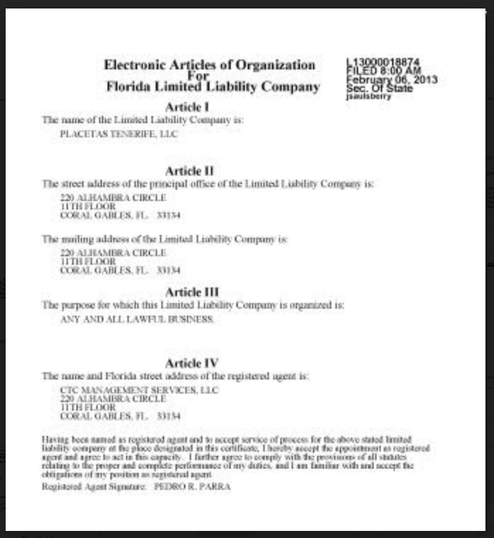 El portal Sunbiz informa que Placetas Tenerife LLC es una empresa registrada en el estado de la Florida el 6 de febrero de 2013, bajo el número L13000018874, FEI/EIN 46-2048375. Su estatus actual es activa, siendo su dirección el 220 Alhambra Circle, 11Th Floor, Coral Gables, FL 33134, que igualmente figura como dirección postal y domicilio del agente registrador y gerencia.