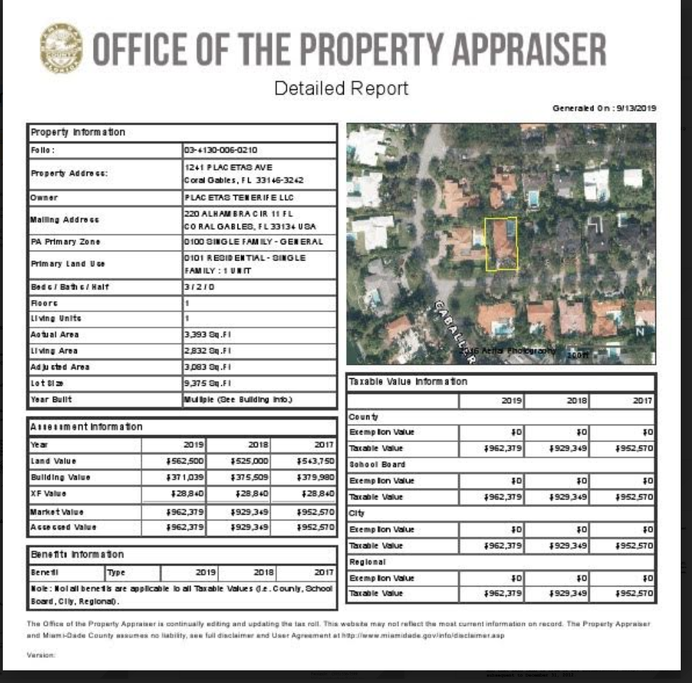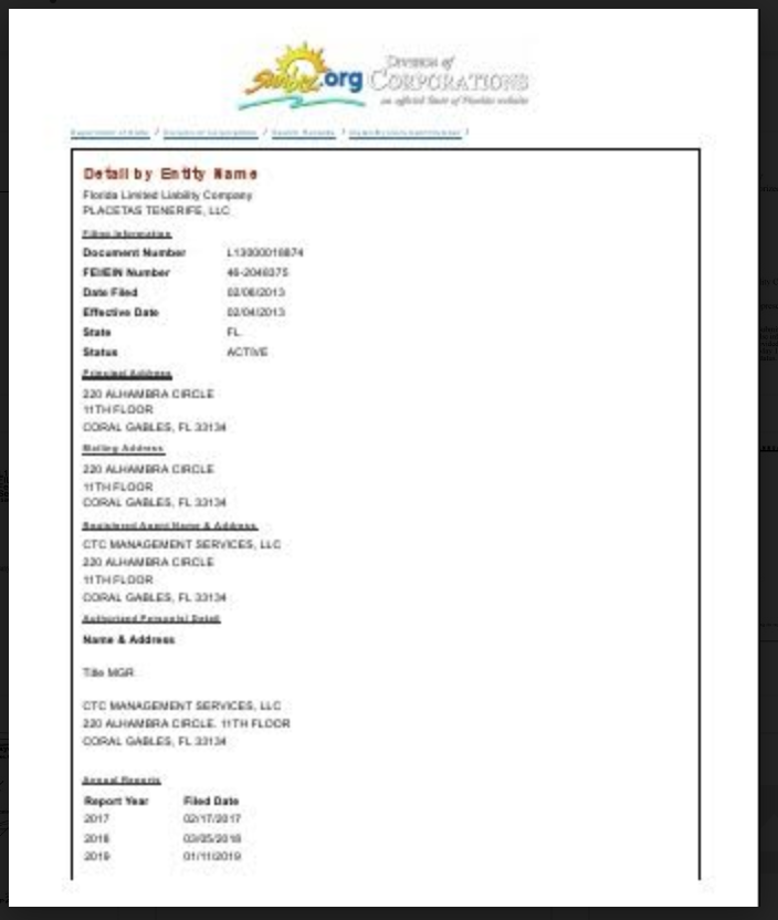 [3] Sunbiz. Placetas Tenerife LLC. Reporte anual. 11 de enero de 2019.