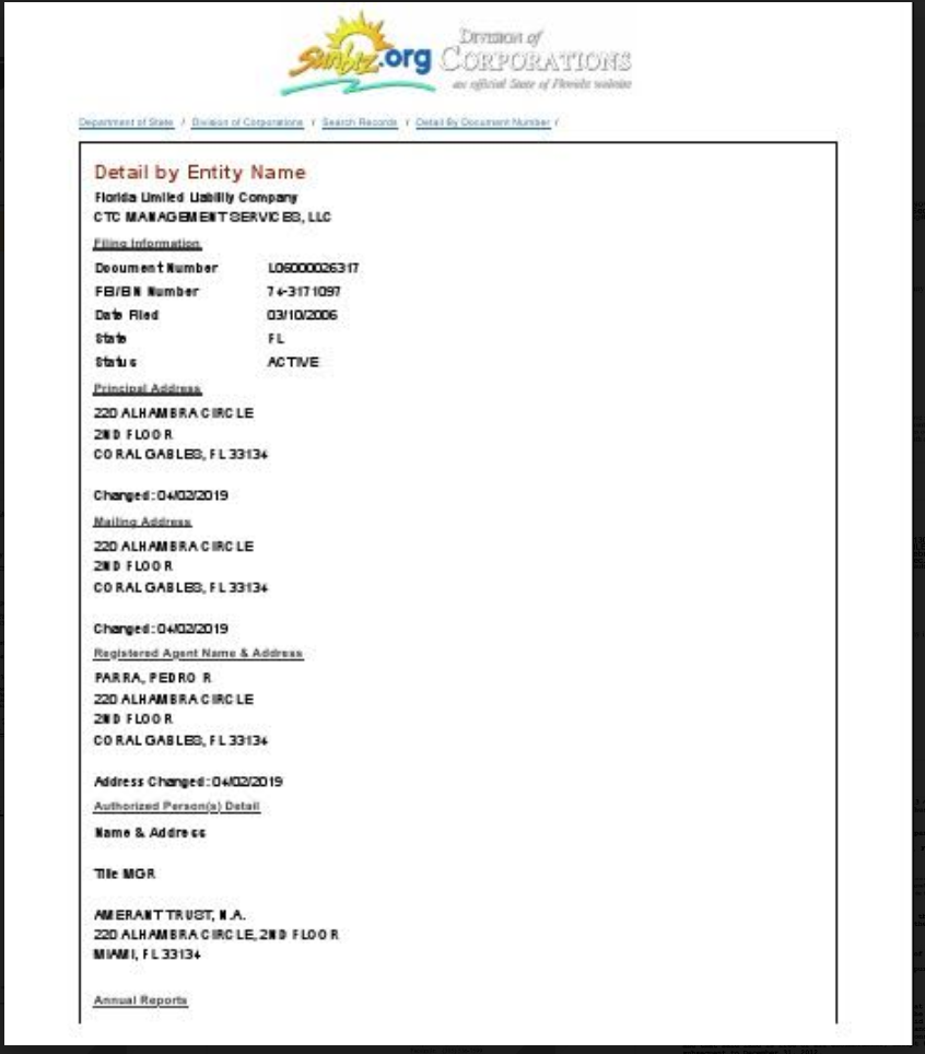 [6] Sunbiz. CTC Management Services LLC. Reporte anual a del 2 de abril de 2019.