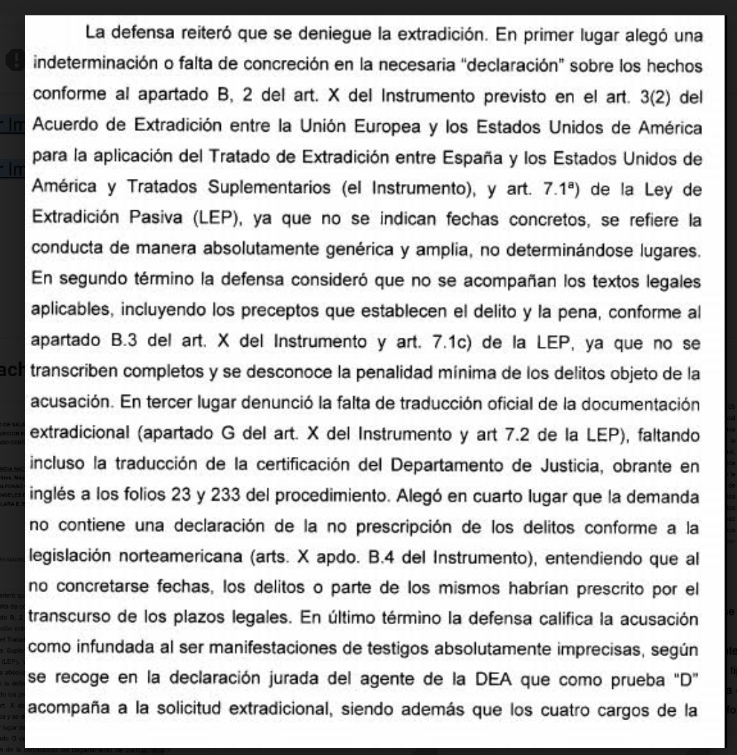 La ponencia pasa a explicar los fundamentos jurídicos de su decisión y refiere, en primer término, que la extradición entre el Reino de España y los Estados Unidos está amparada por la Constitución española, por el Acuerdo de Extradición entre la Unión Europea y EE. UU. y el Tratado Suplementario de Extradición y por la Ley de Extradición Pasiva.
