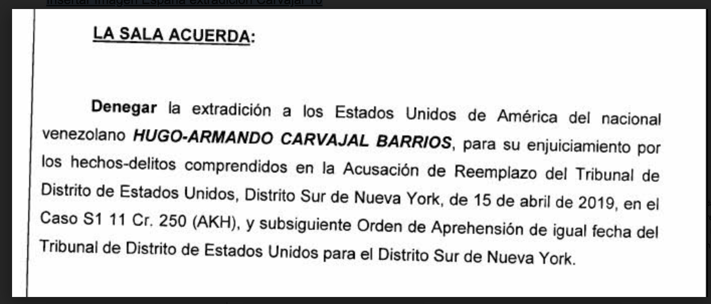 Este conjunto de magistrados acordó “Denegar la extradición a los Estados Unidos de América del nacional venezolano Hugo Armando Carvajal Barrios, para su enjuiciamiento por los hechos-delitos comprendidos en la Acusación de Reemplazo del tribunal de Distrito de Estados Unidos, Distrito Sur de Nueva York, de 15 de abril de 2019, en el Caso S1 11 Cr. 250 (AKH), y subsiguiente Orden de Aprehensión de igual fecha del Tribunal de Distrito de Estados Unidos para el Distrito Sur de Nueva York”.
