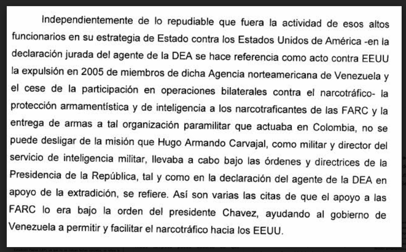 La ponencia advierte que por más repudiables que resulten los hechos señalados a Hugo Carvajal, no existen dudas de que las mismos los llevó a cabo bajo las órdenes u directrices la Presidencia de la República, en específico de Hugo Chávez frías, tal como lo declara el propio agente de la DEA.