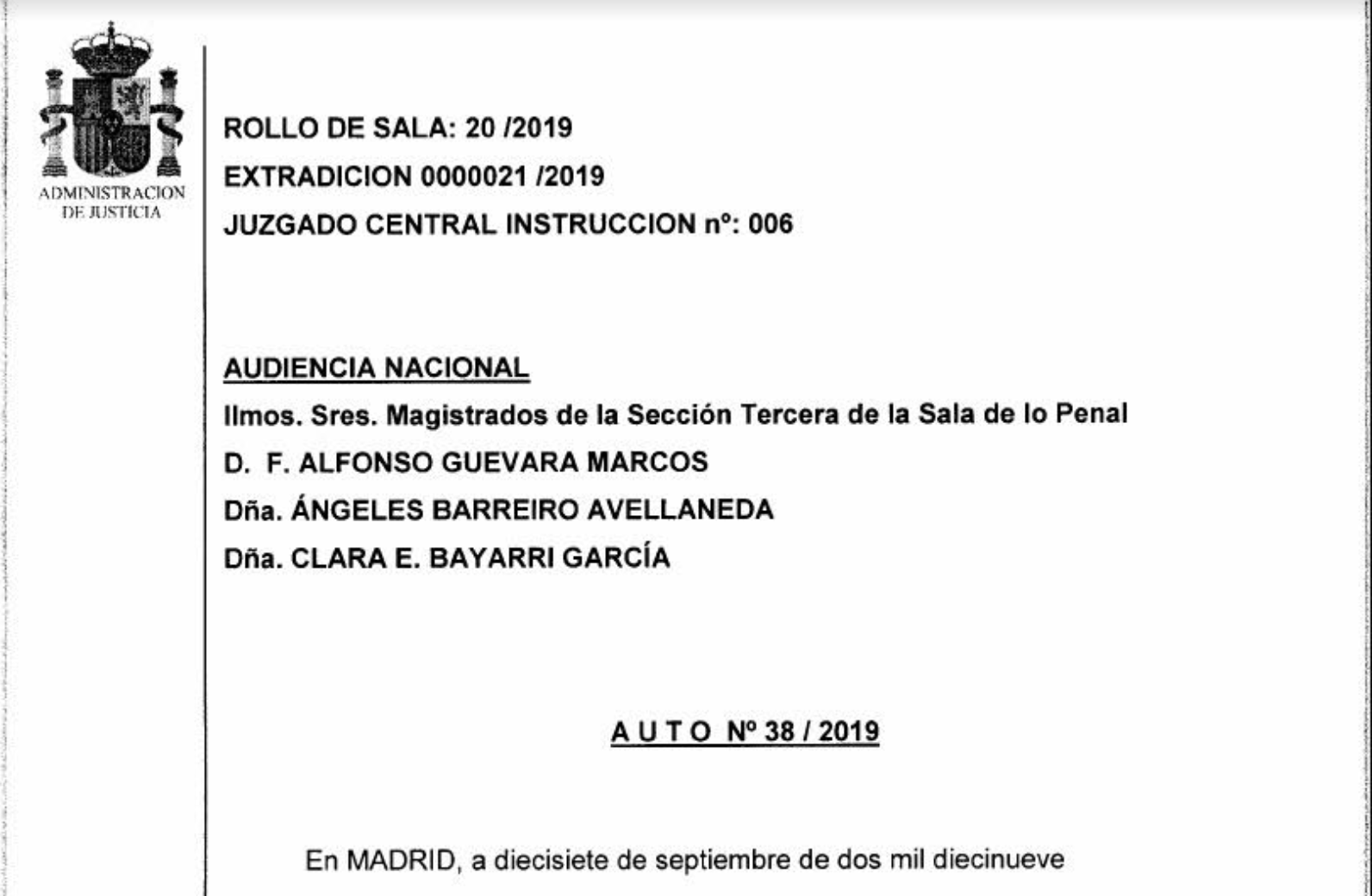 El pasado 17 de septiembre del corriente año 2019, los magistrados de la Sección Tercera de la Sala de lo Penal de la Audiencia Nacional, Alfonso Guevara Marcos, Ángeles Barreiro Avellaneda y Clara E. Bayarri García, emitieron el fallo sobre la solicitud de extradición 0000021/2019, Rollo de Sala 20/2019 correspondiente al proceso de extradición contra el venezolano Hugo Carvajal a quien las instancias de EE. UU. reclamaban.