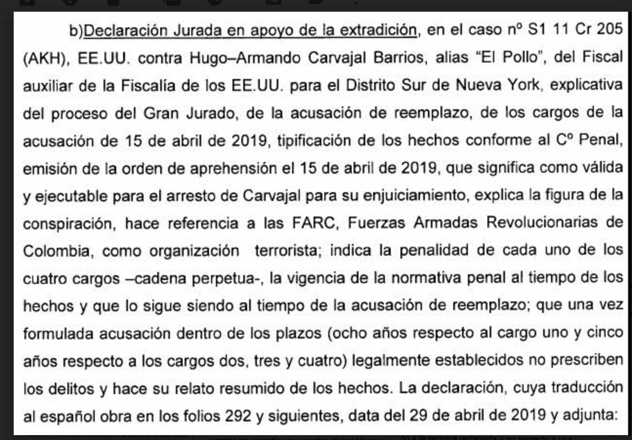 Se hace referencia a la solicitud de extradición presentada por Estados Unidos a través de su embajada para procesar judicialmente a Hugo Armando Carvajal Barrios, alias “El Pollo” en el Tribunal del Distrito Sur de Nueva York por los delitos de asociación ilícita dolosa para involucrarse en el narcoterrorismo; asociación ilícita para importar una sustancia controlada dentro de EE. UU. y dentro del territorio de aduanas de los EE. UU. desde un lugar fuera del país, manufacturar y distribuir una sustancia controlada con intención y a sabiendas de que esa sustancia venía importada ilegalmente a los EE. UU.; uso o posesión de armas de fuego para cometer o posesión de armas durante y en relación con los delitos de sustancias controladas y colaborar e instigar en los mismos y participación en asociación ilícita para usar o poseer armas de fuego durante y en relación con los delitos de sustancias controladas y colaborar e instigar en los mismos.