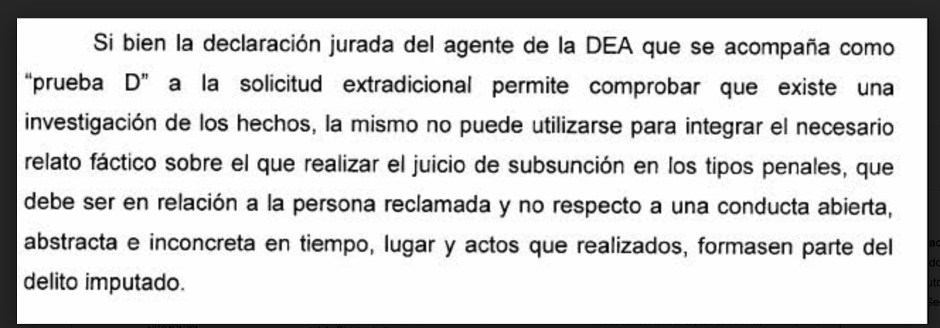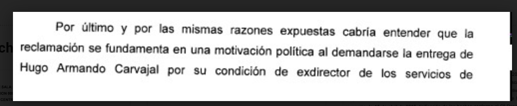 Luego de hacer varias referencias a lo establecido en las leyes españolas aplicables para determinar que se estaba en presencia de delitos militares cometidos por un militar, el magistrado determinó que “la conducta que las autoridades de Estados Unidos imputan a Hugo Carvajal Barrios se refieren ‘indudablemente al ejercicio del servicio de inteligencia militar’ del que fue subdirector y director, dentro de la estrategia dirigida desde la Presidencia de la República para, en coordinación con las Fuerzas Armadas Revolucionarias de Colombia (FARC), atacar intereses de los EE. UU., mediante el transporte hacia los Estados Unidos de grandes cantidades de cocaína, proveyendo de armas a las FARC como pago de la sustancia o facilitando a los guerrilleros protección armamentística.
