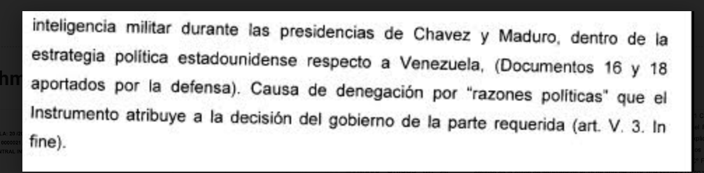Del mismo modo, el magistrado Alfonso Guevara Marcos argumenta que las razones del reclamo tienen una motivación política, al demandarse la entrega del reclamado por su condición de exdirector de la DIM de Chávez y Maduro, “dentro de la estrategia estadounidense respecto a Venezuela”, lo cual es “Causa de denegación por ‘razones políticas’ que el instrumento atribuye a la decisión del gobierno de la parte requerida”.