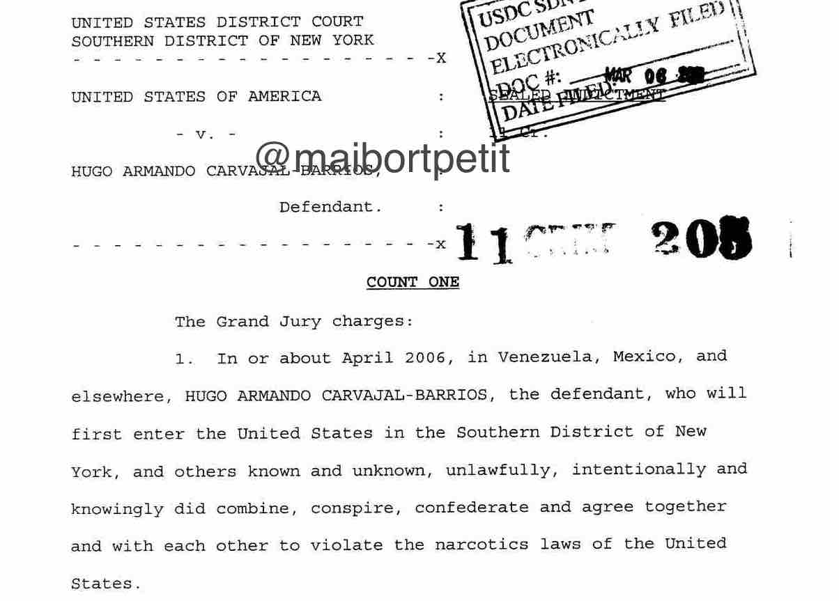 El Gran Jurado determinó que Hugo Carvajal, “en o alrededor de abril de 2006, en Venezuela, México”, junto a sus asociados “de forma ilegal, intencional y a sabiendas se combinaron, conspiraron, confederaron y acordaron juntos y entre sí para violar las leyes de narcóticos de los Estados Unidos”.
