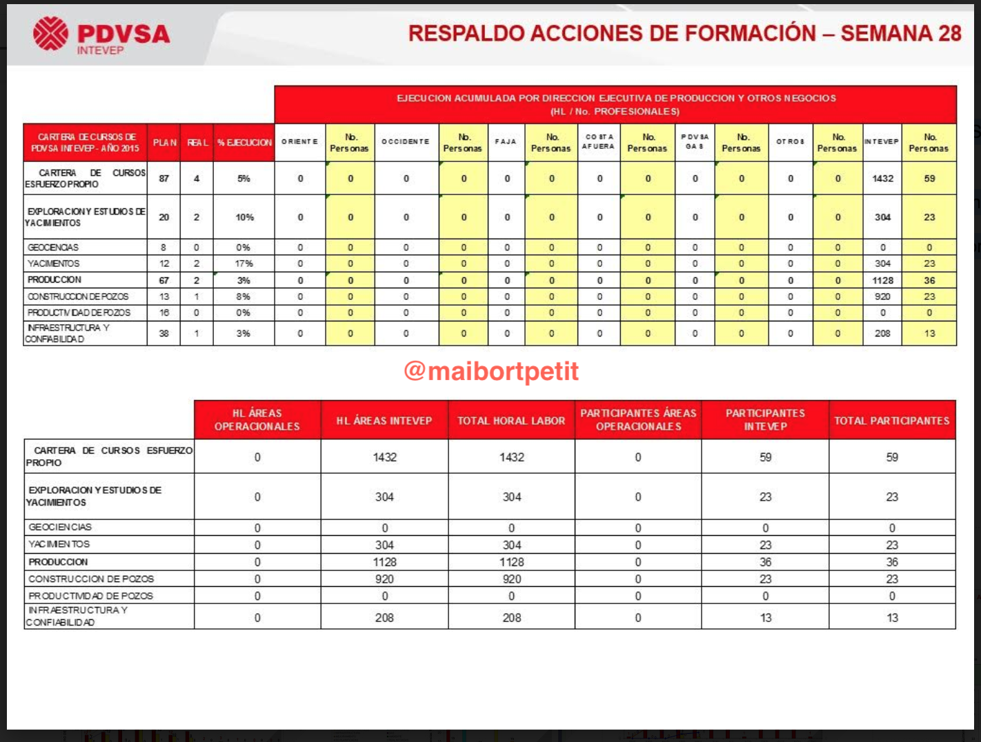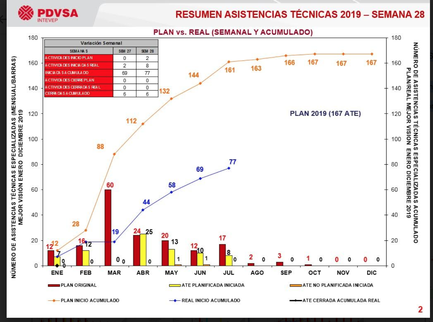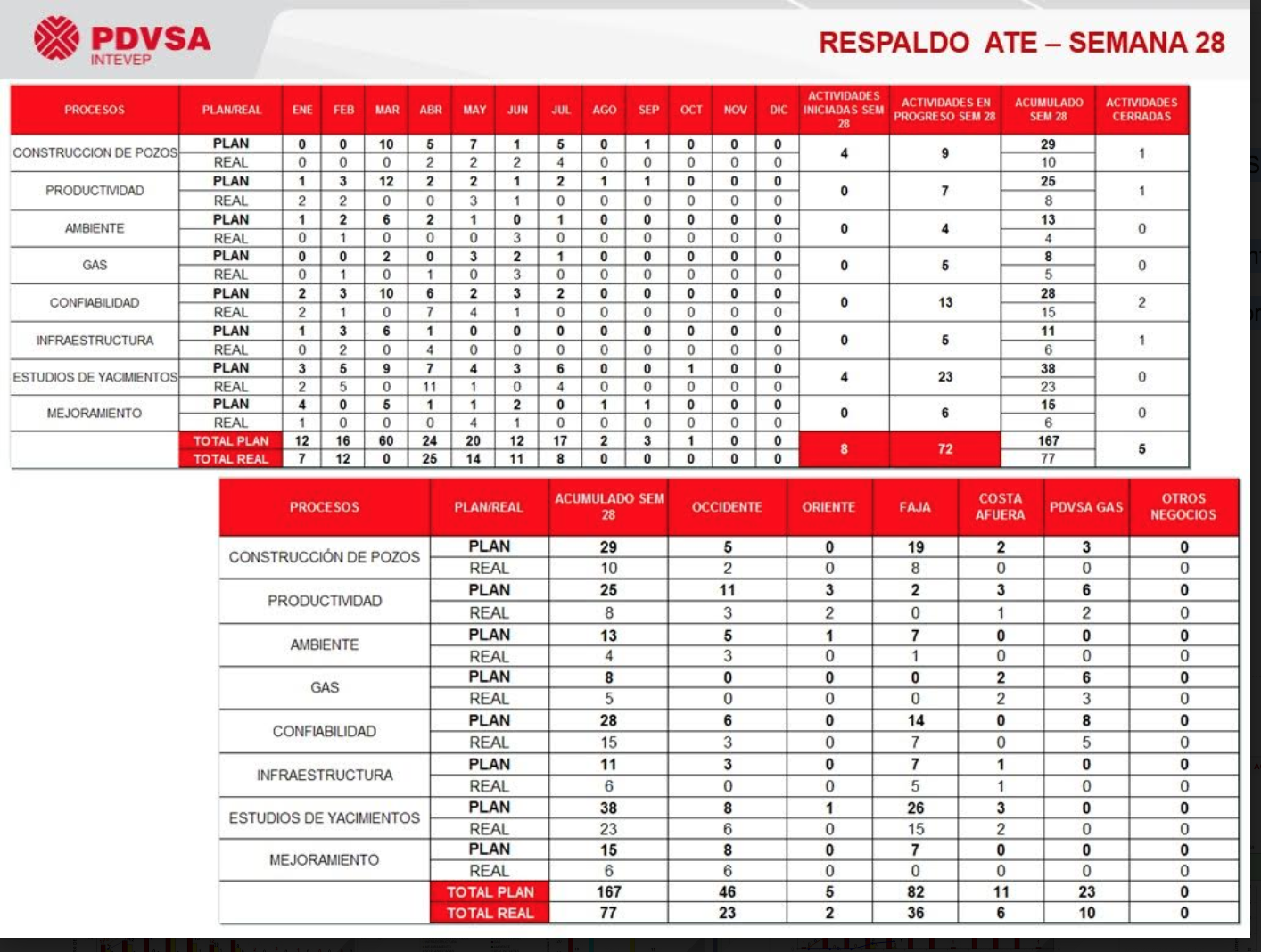 Un reporte del Instituto de Tecnología Venezolana para el Petróleo (Intevep) de Petróleos de Venezuela S.A. correspondiente a la semana 28 (8 al 14 de julio) revela el incumplimiento de las actividades planificadas por el organismo, una muestra más del deterioro que presenta PDVSA.