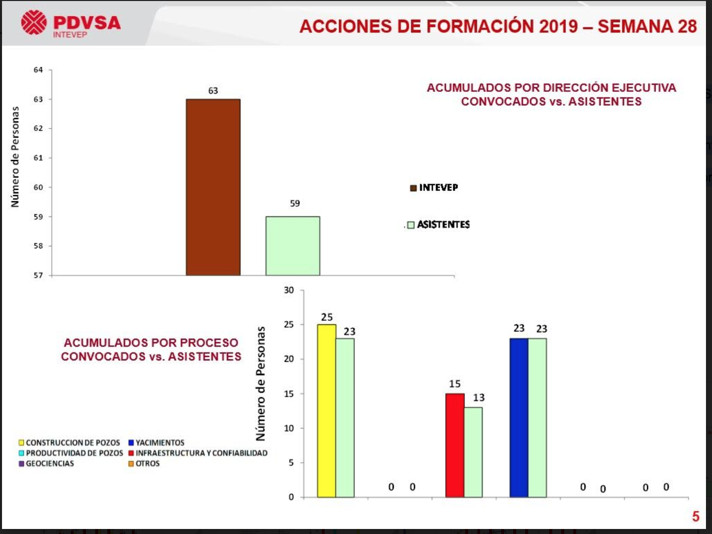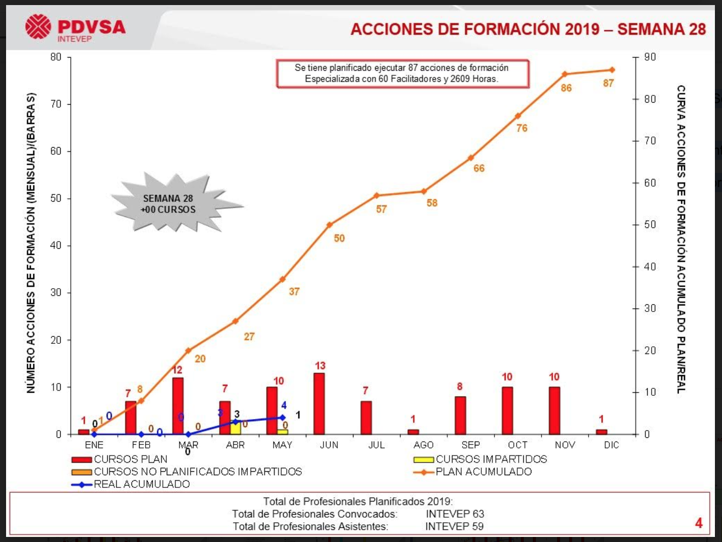 Resumiendo el respaldo recibido, se pone de en evidencia el pobre desempeño de Intevep, estableciéndose que en la Cartera de cursos por esfuerzo propio hubo una planificación de 87 actividades de las cuales solamente se llevaron a cabo 3, es decir, un 5 por ciento de ejecución. De 1.432 personas convocadas, asistieron 59.