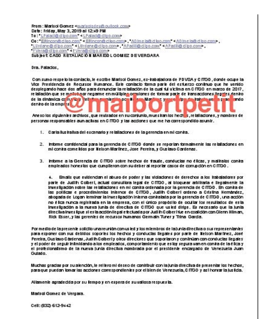 El 3 de mayo de 2019, Marisol Gómez de Vergara remitió un correo electrónico a Luisa Palacios, presidenta de la junta directiva de CITGO, en el que hacía referencia a un caso de retaliación en su contra. La comunicación se emitió con copia a Ángel Olmeta, Édgar Rincón, Luis Urdaneta y Andrés Padilla, también integrantes de la directiva de la empresa. Se exceptuó a Rick Esser.