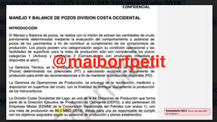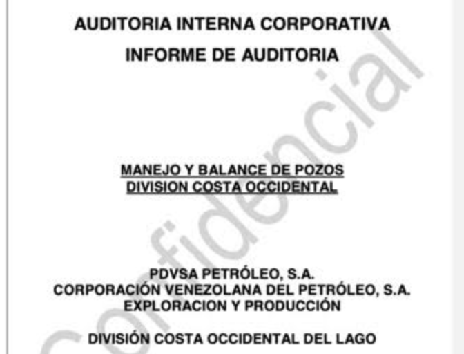 En febrero de 2019, Lisbeth Aguilar, Gerente de Auditoría Interna Occidente, suscribió el informe con carácter confidencial identificado con el serial AIC-EXP-OCC-A-2018-XXX, el cual versaba sobre el manejo y balance de pozos en la División Costa Occidental de Petróleos de Venezuela. La evaluación estuvo a cargo de Diego Nava, Federico Molero, Jesús Manzanilla y Jenny Marín.