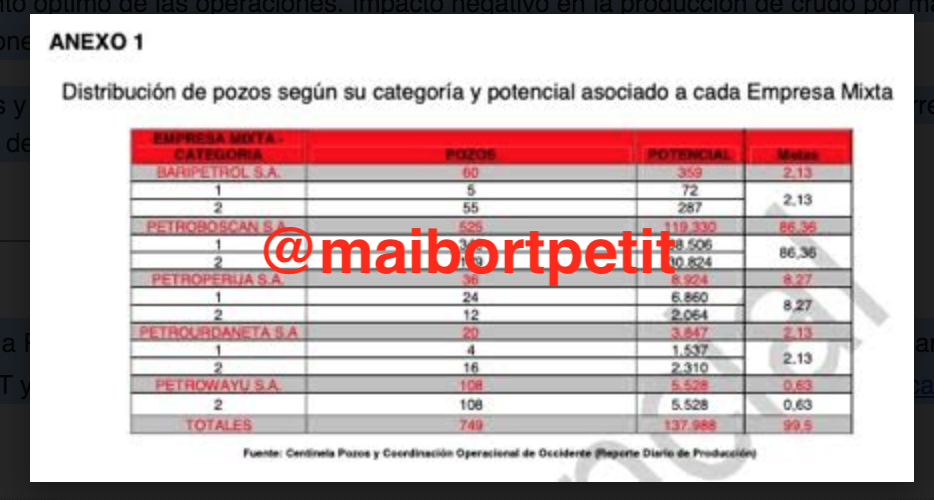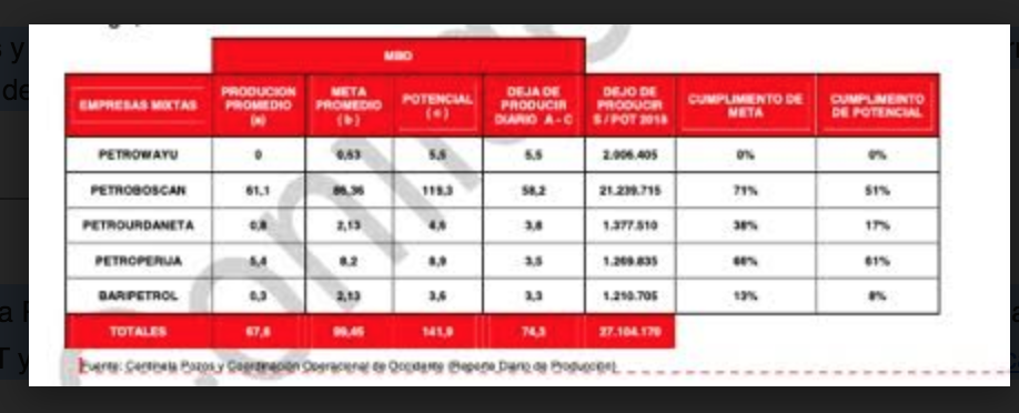 La auditoría acusa que, tal como lo revelan los reportes de producción oficial, el incumplimiento de la producción asociada al potencial de las 5 empresas mixtas de la División Costa Occidental del Lago, tal como se aprecia en el siguiente cuadro: