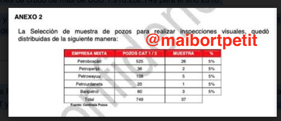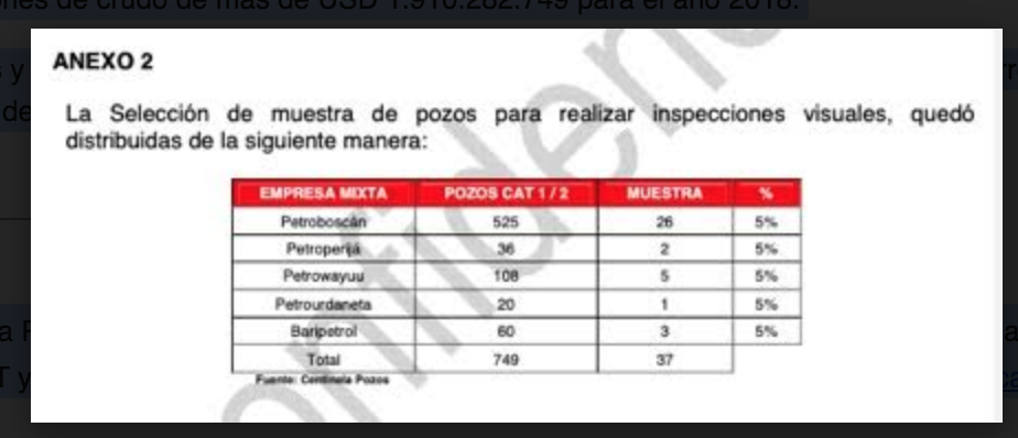 Para llevar a cabo su tarea, los auditores revisaron las cifras de producción de hidrocarburos correspondientes a 749 pozos (137.9 MBD) para el periodo enero-noviembre 2018, correspondiente a 100 por ciento de los pozos categoría 1 y 2 de las empresas mixtas de la División Costa Occidental, a saber, Petroboscán S.A., Petroperijá S.A., Baripetrol S.A., Petrourdaneta S.A. y Petrowayu S.A.