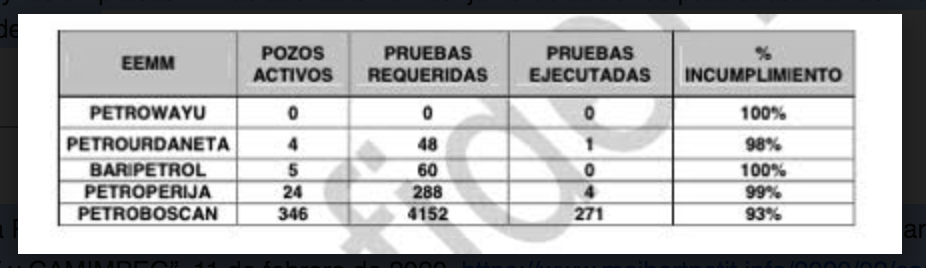 Advierten los analistas que, para el momento de efectuarse la auditoría, había empresas mixtas que presentaban pozos activos y pruebas vencidas de más de 2 años, además de condiciones de fuerza mayor que impedirían el cumplimiento de la ejecución de pruebas.