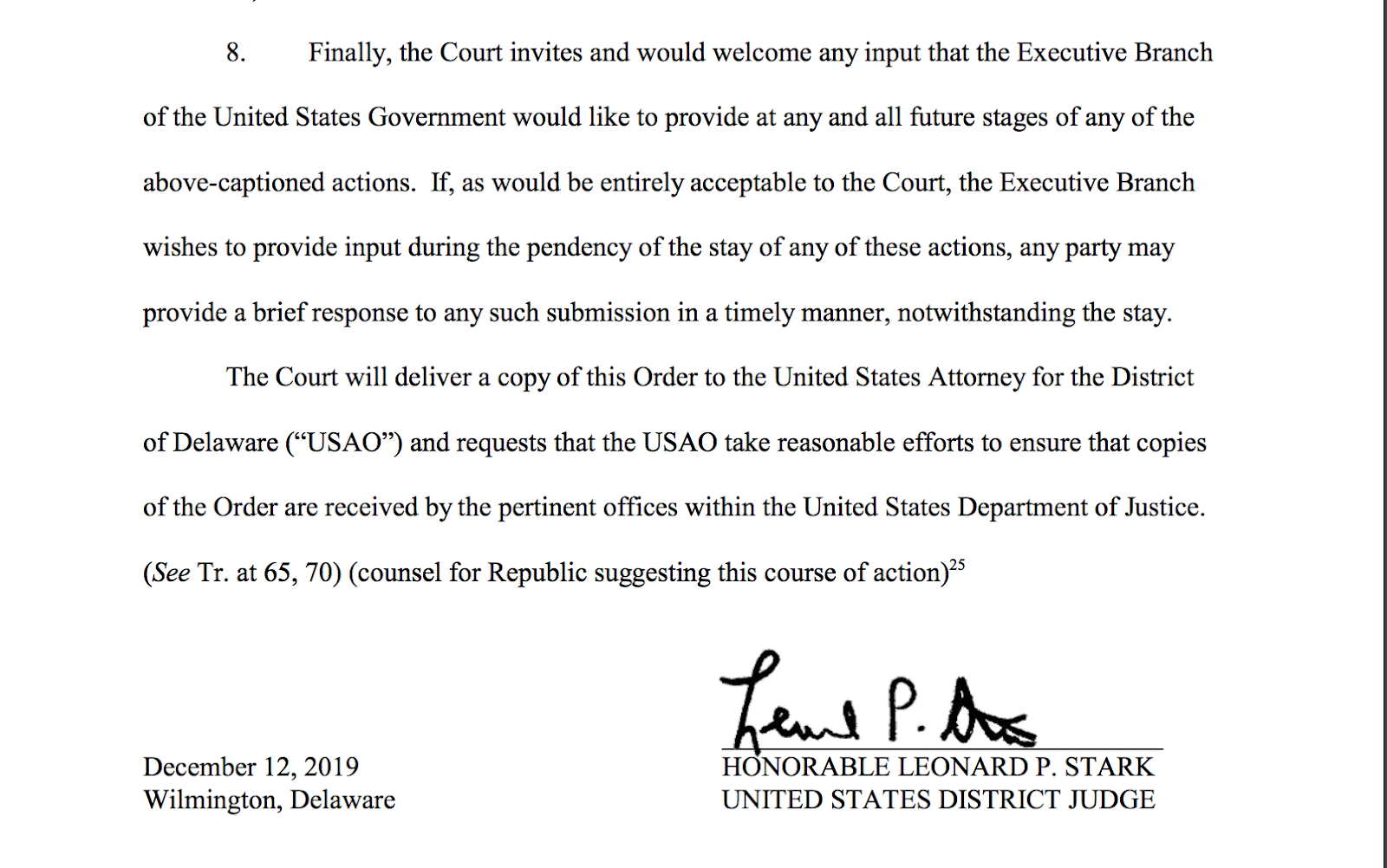 El juez Stark dijo que su tribunal había pedido más orientación del Departamento de Justicia de los Estados Unidos sobre el asunto de las medidas de protección a favor de CITGO.