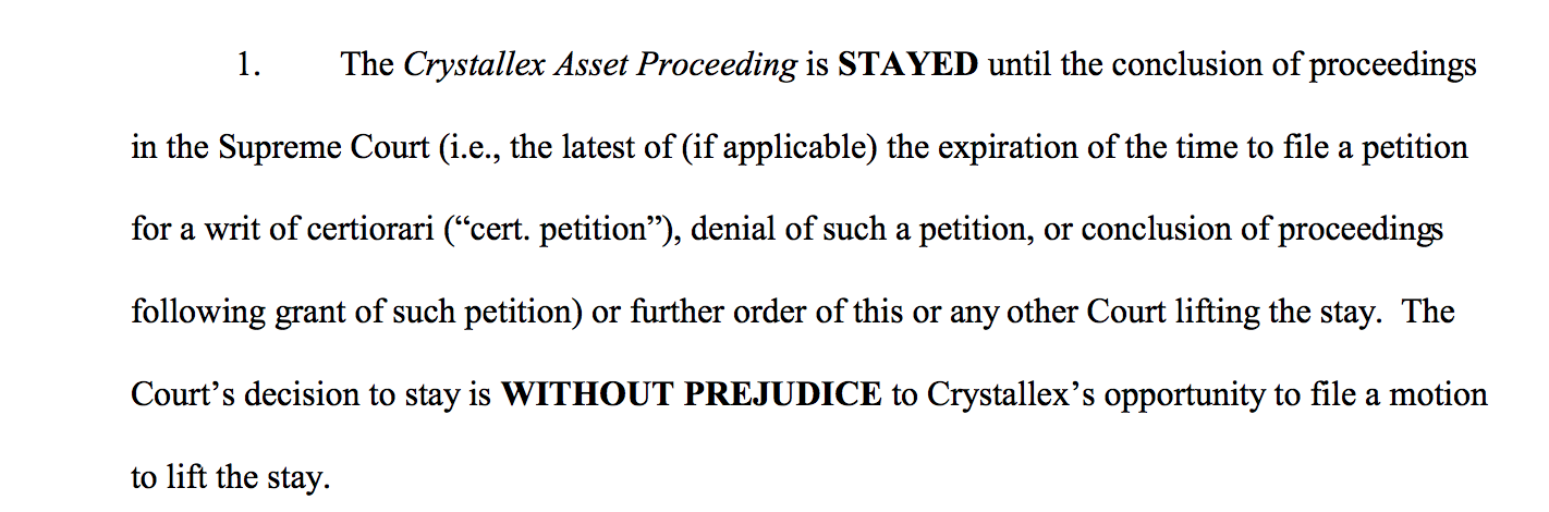 Stark advirtió que si Crystallex considera que la decisión tomada por el tribunal es incorrecta o un abuso de discreción, «puede introducir mociones para levantar la suspensión, o buscar apelar la orden en un tribunal superior».