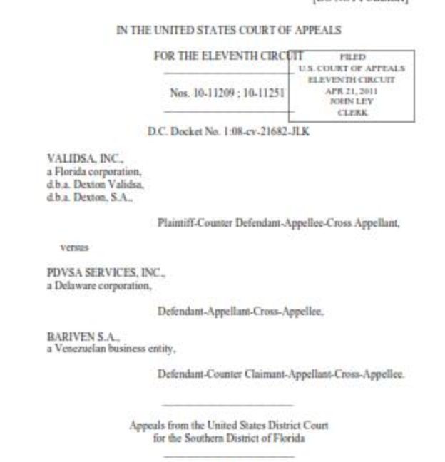 Con fecha 21 de abril de 2011 quedó archivado en el Undécimo Circuito de la Corte de Apelaciones de Estados Unidos el caso distinguido con el número Nº 10-11209; 10-11251 perteneciente al legajo Nº 1: 08-cv-21682-JLK, relativo a una apelación a la sentencia dictada en la demanda interpuesta por Validsa Inc. contra PDVSA Services (PSI) Inc. y Bariven S.A.[3].