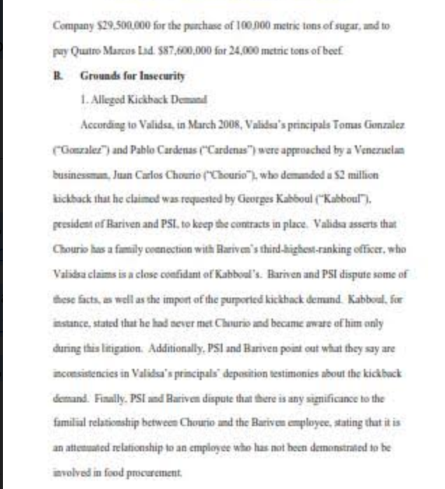 A saber, en noviembre de 2007, PSI y Bariven otorgaron ocho contratos por aproximadamente USD 66 millones a Validsa, de los cuales tres, el Nº 326 para carne de res; el Nº 368 para pollo; y Nº 405 para carne de res fueron cuestionados en el tribunal de distrito.
