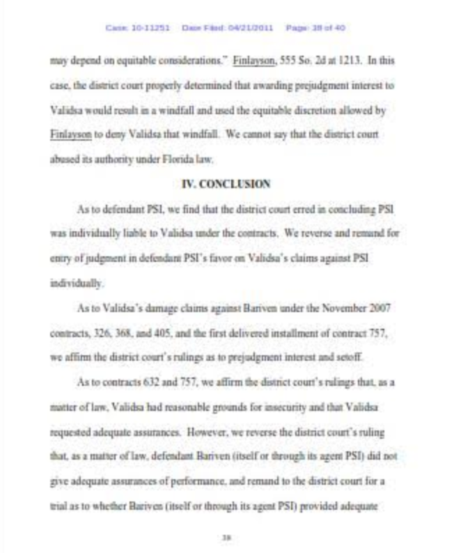 Sobre los contratos 632 y 757, la Corte de Apelaciones confirmó las sentencias del tribunal de distrito de que, por ley, Validsa tenía motivos razonables para la inseguridad y su solicitud de garantías adecuadas. “Sin embargo, revocamos la decisión del tribunal de distrito de que, como cuestión de derecho, el acusado Bariven (a sí mismo o a través de su agente PSI) no dio garantías adecuadas de desempeño, y lo remitió al tribunal de distrito para un juicio en cuanto a si Bariven (sí mismo o a través de su agente PSI) proporcionó garantías adecuadas. Debido a que esta cuestión de hecho regirá si Bariven incumplió anticipadamente los contratos 632 y 757, revocamos la desestimación por parte de la corte de distrito de los numerales I, II, V y VI de las contrademandas de Bariven con respecto a los contratos 632 y 757, que se basó en la sentencia sumaria del tribunal de distrito que Bariven violó esos contratos como una cuestión de derecho”.