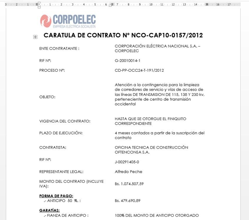 Así tenemos que el contrato Nº NCO-CAP10-0157/2012 lo suscribió la Corporación Eléctrica Nacional (Corpoelec) con la empresa Oficina Técnica de Construcción Oftenconsa S.A., RIF J-00291405-0, representada por Alfredo Peche. Se atendería la contingencia para la limpieza de corredores de servicio y vías de acceso de las líneas de transmisión de 115, 138 Y 230 kv, perteneciente de centro de transmisión occidental.