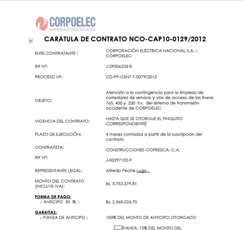 El contrato NCO-CAP10-0115/2012 se firmó con Construcciones Copresca C.A., RIF J-00297102-9, representada por Alfredo Peche Lugo, para atender líneas 765, 400, 230 Y 115 Kv,  del sistema de transmisión sur de Corpoelec.