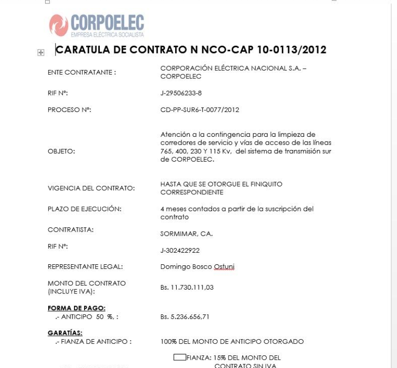 El contrato N° NCO-CAP 10-0113/2012 se firmó con la empresa Sormimar C.A., RIF J-302422922, representada por Domingo Bosco Ostuni, igual, para la atención a la contingencia para la limpieza de corredores de servicio y vías de acceso de las líneas 765, 400, 230 y 115 Kv,  del sistema de transmisión sur de Corpoelec.
