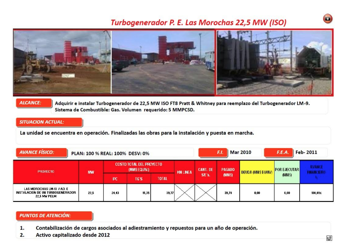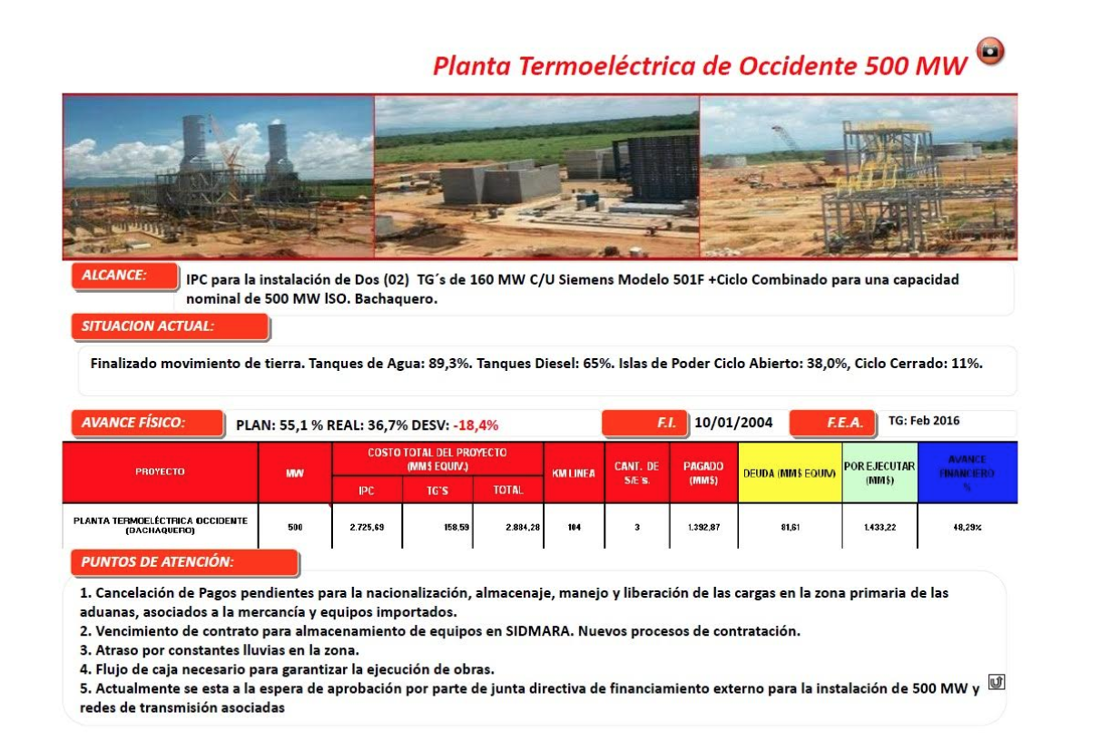 Un informe elaborado en julio de 2016 revela que de los siete proyectos eléctricos llevados a cabo por Petróleos de Venezuela S.A. en el occidente del país desde el año 2004, solamente dos estaban cien por ciento concluidos al momento de redactar el reporte —al menos de acuerdo a la planificación— y los restantes cinco se encontraban paralizados, según refieren fuentes consultadas para la elaboración de esta nota. Sin embargo, el informe en cuestión da cuenta de una tercera unidad concluida al cien por ciento, a saber, la Planta Eléctrica Las Morochas.