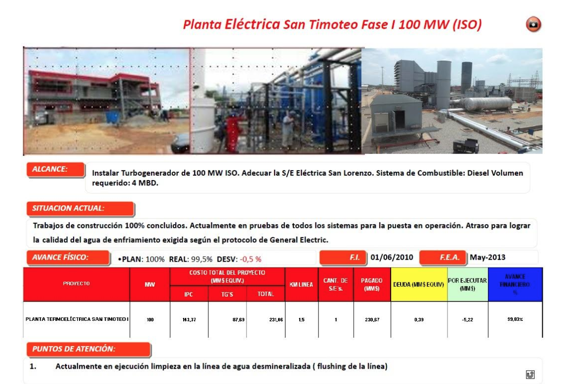 La Planta San Timoteo I, ejecutada por General Electric para instalar una máquina modelo LM100 con capacidad para generar 100 MW ISO, en fase de construcción para el momento del informe, presentaba un avance físico de acuerdo al plan de 100 por ciento, pero que en la realidad era de 99,50 por ciento.