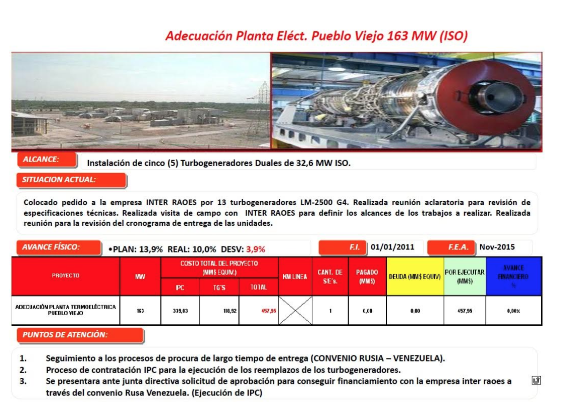 Fuentes ligadas a estos proyectos —consultadas bajo condición de anonimato— refieren que los dos proyectos concluidos son la Planta San Timoteo I y la Planta Barinas I, únicos que lograron incorporar megavatios al Sistema Eléctrico Nacional (SEN). La primera fue concluida en el año 2013, encontrándose parada desde junio de 2014 por una falla que no se ha logrado definir. A esta unidad se le practicó una inspección boroscópica, un tipo de análisis que solamente se realiza cuando las unidades presentan una falla interna grave en los alabes de la turbina o el turbogenerador.